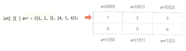 - 이렇게 이차원 배열을 초기화하면 괄호 안에 적은 6개의 값이 순서대로 arr 배열의 각 요소에 저장됩니다.