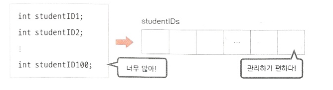 학교에 학생이 100명 있습니다. 학번의 자료형을 정수라고 하면 학생이 100명일 때 int studentID1, int studentID2, int studentID3,...,int studentId100 이렇게 변수 100개를 선언해서 사용해야 합니다. 그런데 학번에 대한 여러 개 변수들을 일일이 쓰는 것은 번거로운 일입니다. 이때 사용하는 자료형이 **배열(array)**입니다.