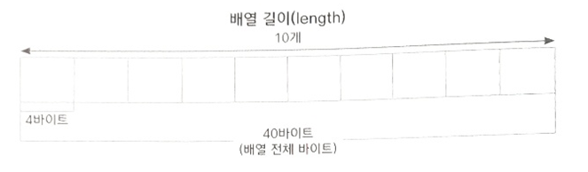 - 배열 요소를 저장할 수 있는 공간이 총 10개이므로 이 배열을 위해 총 40바이트의 메모리가 할당되는 것입니다.