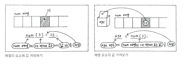 - 예를 들어 int형으로 선언한 num배열의 네 번째 요소에 값 25를 저장하고, 그 값을 가져와 int형 변수 age에 저장한다면 다음 그림과 같습니다.