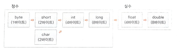 - 바이트 크기가 작은 자료형에서 큰 자료형으로 형 변환은 자동으로 이루어진다.