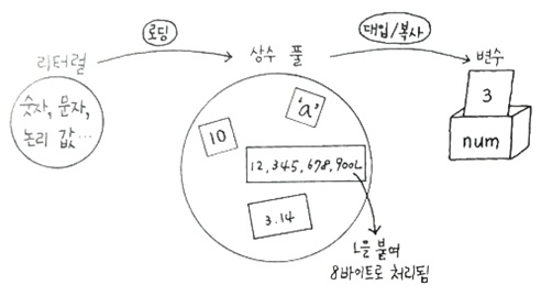 - 리터럴은 프로그램이 시작할 때 시스템에 같이 로딩되어 특정 메모리 공간인 상수 풀(constant pool)에 놓입니다. 예를 들어 int num=3; 문장에서 값 3이 메모리 공간 어딘가에 존재해야 num 변수에 그 값을 복사할 수 있습니다.